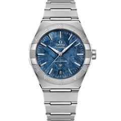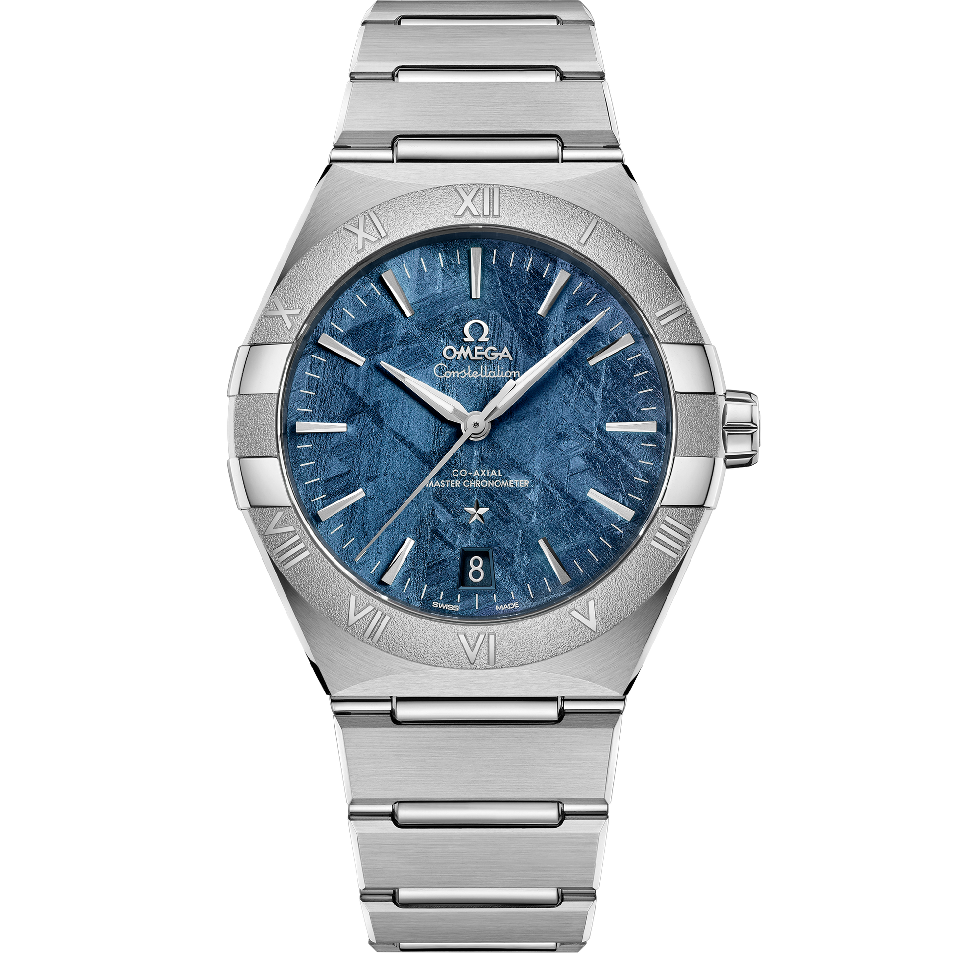 The astonishing dial is formed from a genuine piece of iron meteorite, which has been given a blue colour treatment. The natural pattern within the meteorite is unique to each model, meaning that no two dials are ever the same. It is completed with a date window at 6H, along with hands, indexes, and a Constellation star in 18K white gold.