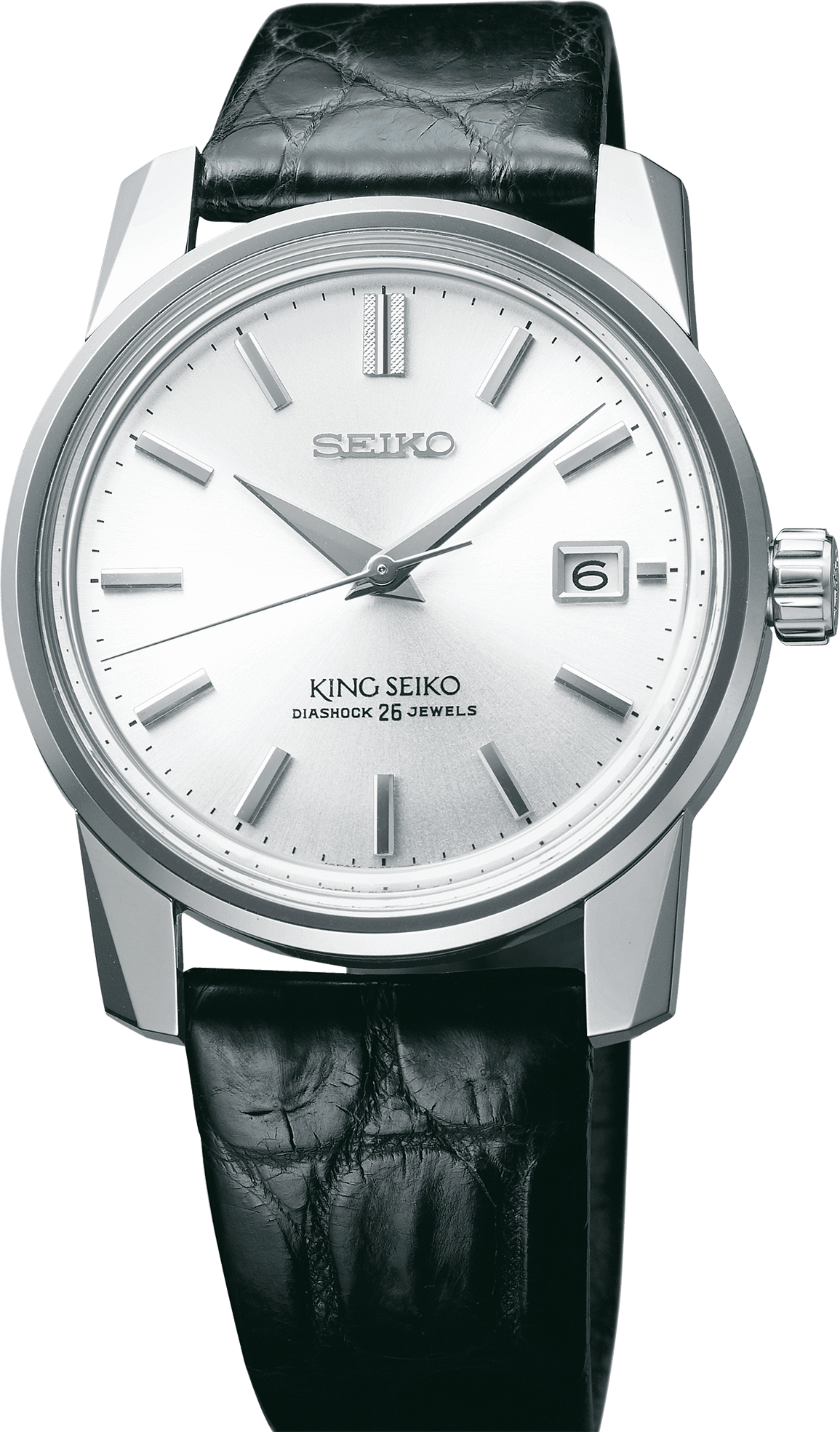 140th Anniversary King Seiko Limited Edition. Re-created in celebration of the 140th Anniversary of Seiko, this regal Limited Edition brings back the elegant dress/sport King Seiko KSK from 1965, known for its sharply angled flat lugs, versatility and dignified appearance. Available in a Limited Edition of 3,000, with the serial number engraved on each King Seiko emblem caseback, this landmark version of one of Seiko's first luxury watches reflects the majestic lines of the original, with a slightly larger screwback case as well as an upgraded thin automatic movement and box-shaped sapphire crystal with anti-reflective coating on the inner surface. The distinctive silver dial includes a date calendar, as well as a specially textured marker at 12 o'clock. With a frequency of 28,800 vibrations per hour, the 26-jewel automatic movement provides manual winding as well as a power reserve of approximately 45 hours. Crafted of stainless steel with super-hard coating, this distinctive watch includes a black crocodile strap with stylized Seiko logo buckle. Each comes housed in a special collectors' box. 5 bar, 50M Water Resistant.