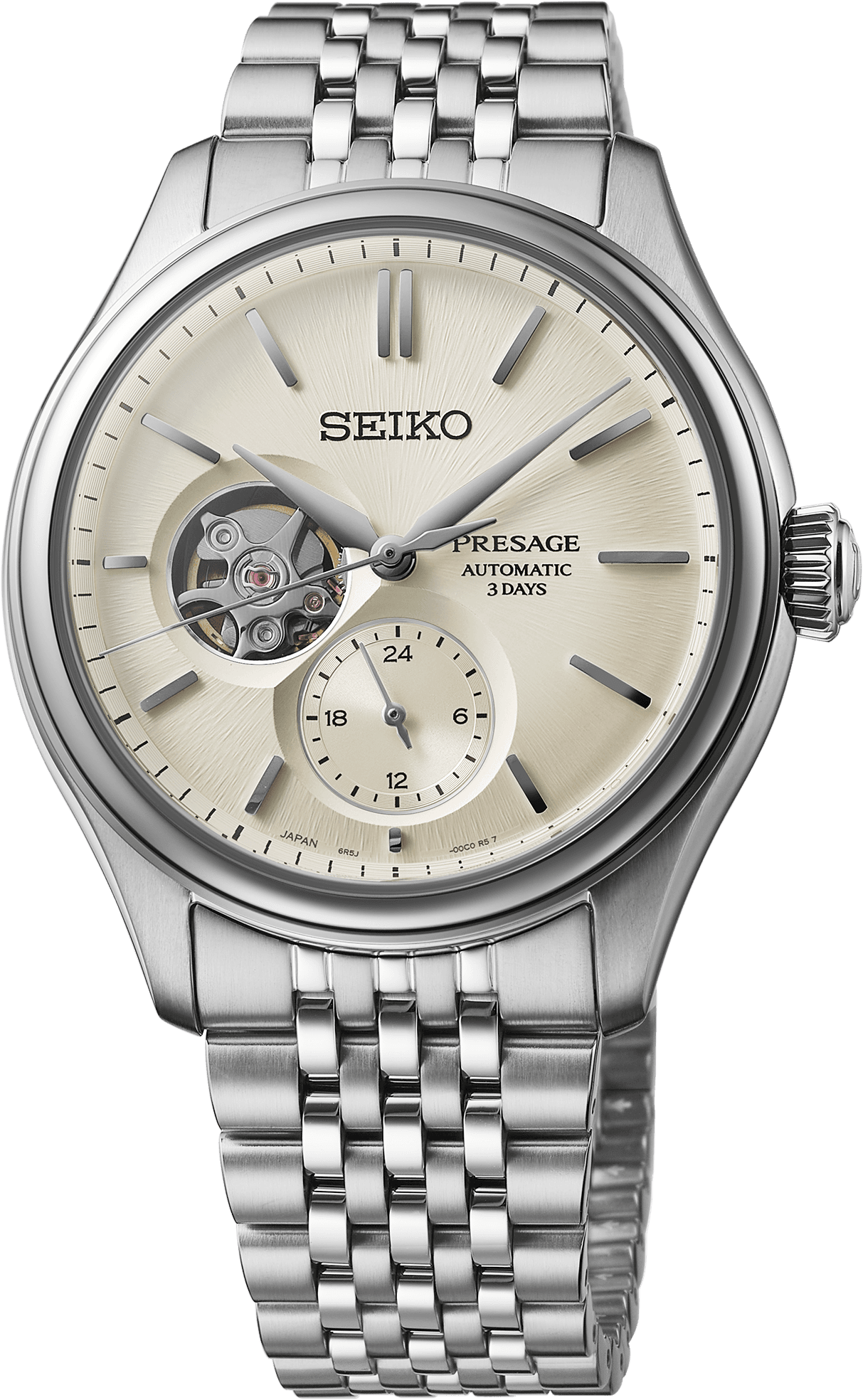 Presage Classic Series. Offering the finest in Japanese mechanical watchmaking, the Presage Collection blends precision technology with superior craftsmanship and design. The Presage Classic Series draws from the colors, materials and textures of traditional crafts, each timepiece gracefully expressing Japan’s timeless beauty. In “shiro-iro,” the color of unbleached natural silk fabric, the curved dial of this streamlined design has a richly textured pattern that evokes raw silk yarn, while capturing and reflecting ambient light to create a heightened sense of depth and beauty. Visible through both the open aperture dial and see-through caseback Seiko’s 6R caliber, 24-jewel automatic movement beats at a frequency of 21,600 vibrations per hour, with an exceptional power reserve of 72 hours, manual winding capability and a 24-hour complication. Crafted of stainless steel, the case is constructed with smooth curved surfaces and includes a dual curved sapphire crystal, echoing the contours of the dome-shaped dial. The retro-inspired multi-row bracelet with curved top surfaces helps achieve a superbly sleek and comfortable fit and is equipped with a deployment clasp with push button release. 10 bar, 100M Water Resistant