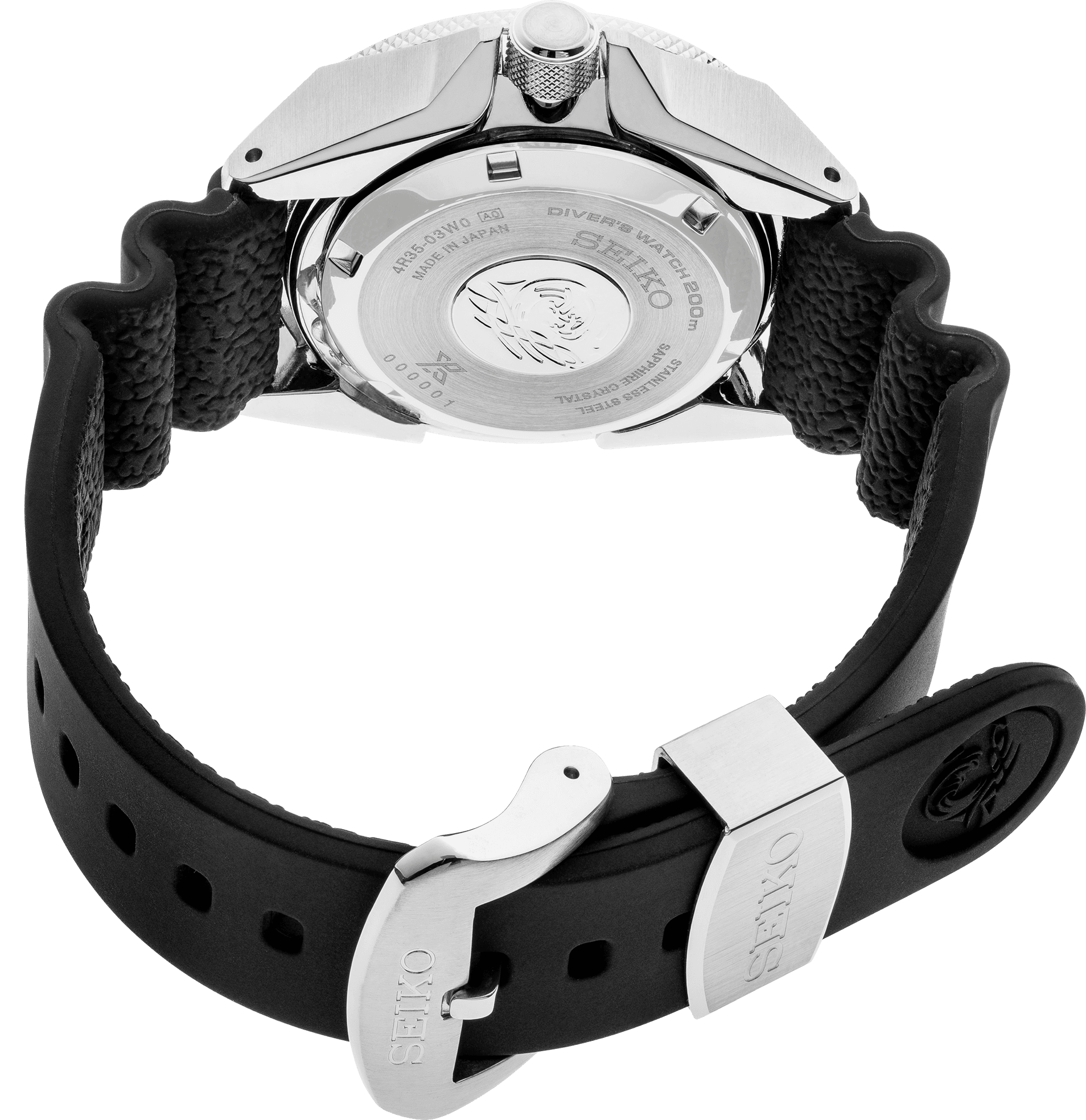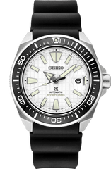 Prospex Automatic Diver. Designed for those who treat life as the ultimate adventure, the Seiko Prospex line meets every challenge with technological excellence and winning design. Inspired by Seiko's most iconic diving styles, this distinctive watch includes such upgrades as a black ceramic one-way rotating elapsed timing bezel, magnified date window and sapphire crystal with anti-reflective coating on the inner surface. The white dial, with LumiBrite hands and markers, has a 3-D pattern reflecting the shape of the black and gray bezel edge. For reliable underwater timekeeping, the 23-jewel automatic movement beats at a frequency of 21,600 vibrations per hour, with a power reserve of approximately 41 hours, and can be wound manually or automatically. Crafted of stainless steel, with black silicone strap and secure screwdown crown and caseback, this high-intensity timepiece follows ISO standards for scuba diving. 200m Water Resistant