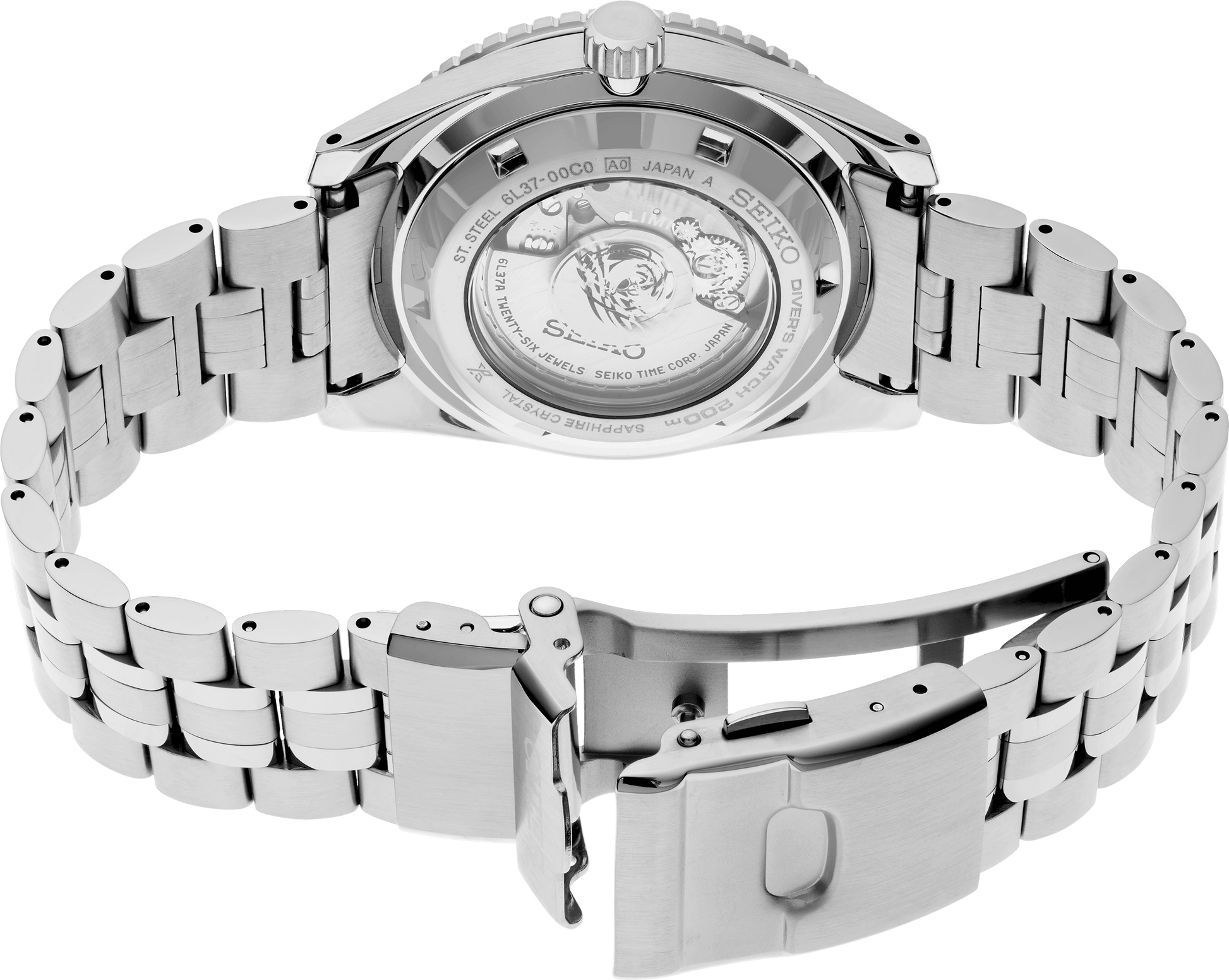 Prospex Marinemaster 1965 Heritage Diver's Watch. Distinguished by its blend of functionality and aesthetics, this extraordinary timepiece, part of the first globally launched watch series to bear the “Marinemaster” name, features the first see-through screwdown caseback on a Seiko diver’s watch, as well as an elegantly chamfered case and bezel and a flexible double-curved bracelet for a comfortable fit. Based on Seiko’s and Japan’s first diver’s watch from 1965, this exceptional timepiece extends the Prospex tradition of celebrating its rich legacy of innovation in high-intensity timekeeping by re-creating and re-interpreting signature achievements with today’s finest technology and materials. Visible beneath the caseback, the thin, but exceptionally accurate, 26-jewel 6L37 movement beats at a frequency of 28,800 vibrations per hour and provides a power reserve of approximately 45 hours and manual winding capability. Framed by a uni-directional rotating elapsed timing bezel, the distinctively patterned dark blue dial offers LumiBrite hands and markers. As rugged as it is stylish, this premium diver’s watch, following ISO standards for scuba diving, is crafted of stainless steel with a durable super-hard coating and features a box-shaped sapphire crystal with anti-reflective coating on the inner surface, screwdown crown, and a tri-fold push button release clasp with secure lock and extender. Packaged in a special collectors’ box. 200m Water Resistant