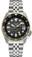 Seiko 5 Sports SKX GMT U.S. Special Creation. Adding new richness to classic sport/dress design, this stylish watch delivers all-day versatility with a cutting edge. With its GMT function and stylish five-row bracelet, this dynamic watch offers a new variation on the popular "SKX" style. Equipped with automatic technology that you control with every movement, this versatile timepiece is powered by a 24-jewel movement that beats at a frequency of 21,600 vibrations per hour, with a power reserve of approximately 41 hours and manual winding capability. The first SKX design to offer a two-tone case, this exceptional watch features a charcoal gray dial with bold luminous hands and markers, and a magnified date calendar, as well as a large gold-tone GMT hand for easy second time zone tracking. Crafted of stainless steel in two-tone finish, with a bi-color 24-hour GMT bezel, tri-fold push button release clasp and lock, and a screwdown see-through caseback for a view of classic timekeeping in action. 10 bar, 100M Water Resistant