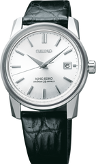 140th Anniversary King Seiko Limited Edition. Re-created in celebration of the 140th Anniversary of Seiko, this regal Limited Edition brings back the elegant dress/sport King Seiko KSK from 1965, known for its sharply angled flat lugs, versatility and dignified appearance. Available in a Limited Edition of 3,000, with the serial number engraved on each King Seiko emblem caseback, this landmark version of one of Seiko’s first luxury watches reflects the majestic lines of the original, with a slightly larger screwback case as well as an upgraded thin automatic movement and box-shaped sapphire crystal with anti-reflective coating on the inner surface. The distinctive silver dial includes a date calendar, as well as a specially textured marker at 12 o’clock. With a frequency of 28,800 vibrations per hour, the 26-jewel automatic movement provides manual winding as well as a power reserve of approximately 45 hours. Crafted of stainless steel with super-hard coating, this distinctive watch includes a black crocodile strap with stylized Seiko logo buckle. Each comes housed in a special collectors’ box. 5 bar, 50M Water Resistant.