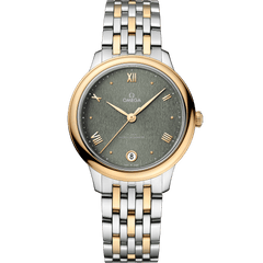 A timeless collection since 1994, the OMEGA De Ville Prestige is now in its third generation Continuing to represent classical design and refined elegance, the timepieces offer a range of patterns, finishes and colours to suit different lifestyles and personalities In this 34 mm stainless steel - 18K yellow gold model, the PVD matcha green dial features a stamped random vertical pattern in a sun-brushed finish The display is distinguished by yellow gold-plated hands, as well as alternating Roman numerals and cabochon indexes The pure look of the timepiece is completed by a date window at 6 o’clock, and a dotted minute track on the outer zone This Master Chronometer certified watch is presented on a stainless steel - yellow gold bracelet and is driven by the OMEGA Master Co-Axial Calibre 8800, which can be admired through the scratch-resistant sapphire crystal caseback