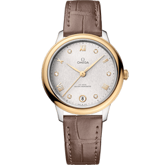 A timeless collection since 1994, the OMEGA De Ville Prestige is now in its third generation Continuing to represent classical design and refined elegance, the timepieces offer a range of patterns, finishes and colours to suit different lifestyles and personalities In this 34 mm stainless steel - 18K yellow gold model, the silvery dial features a stamped random vertical pattern in a sun-brushed finish The display is distinguished by yellow gold-plated hands, as well as alternating Roman numerals and diamond markers The pure look of the timepiece is completed by a date window at 6 o’clock, and a dotted minute track on the outer zone This Master Chronometer certified watch is presented on a shimmering taupe brown leather strap and is driven by the OMEGA Master Co-Axial Calibre 8800, which can be admired through the scratch-resistant sapphire crystal caseback
