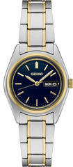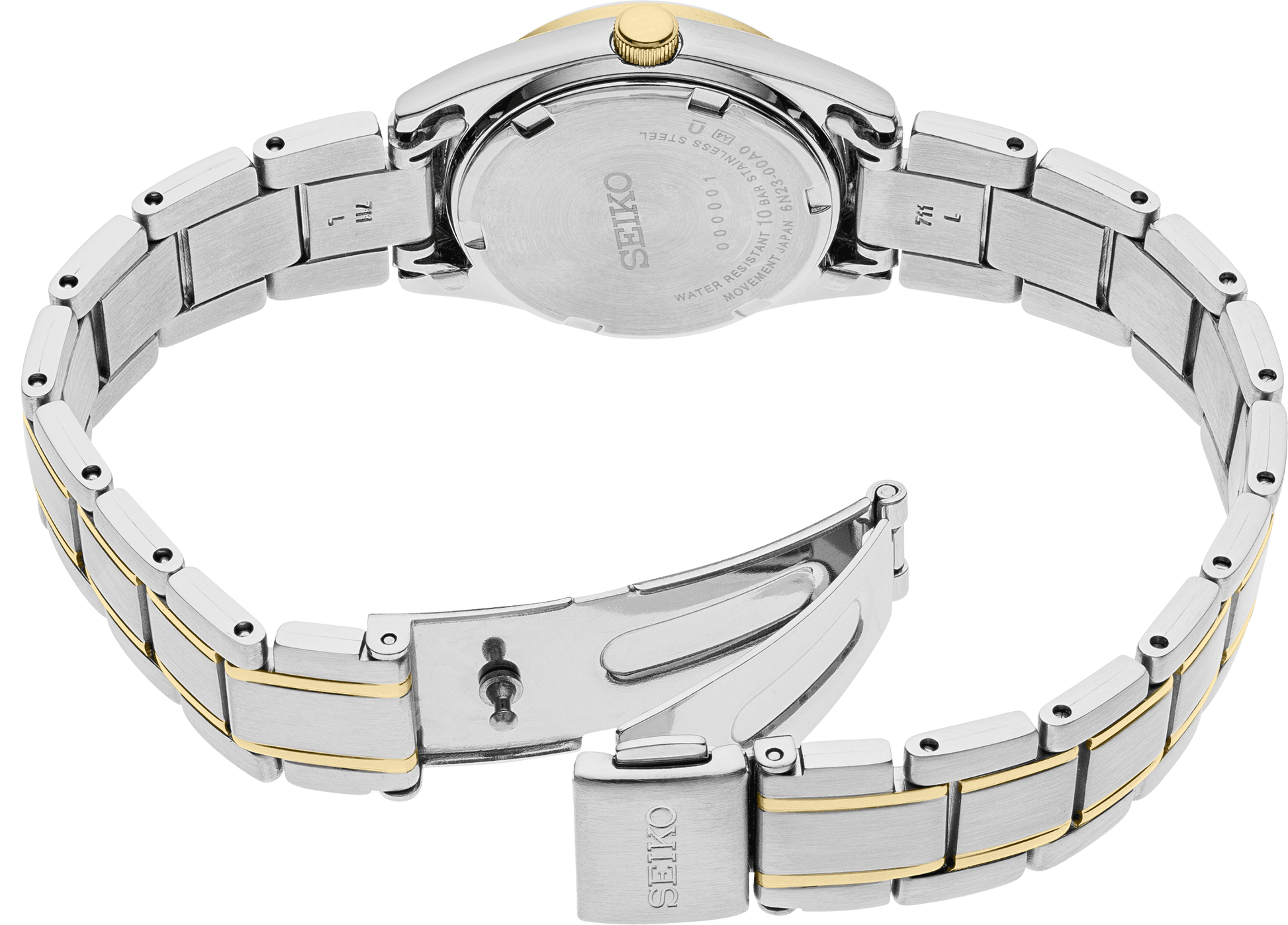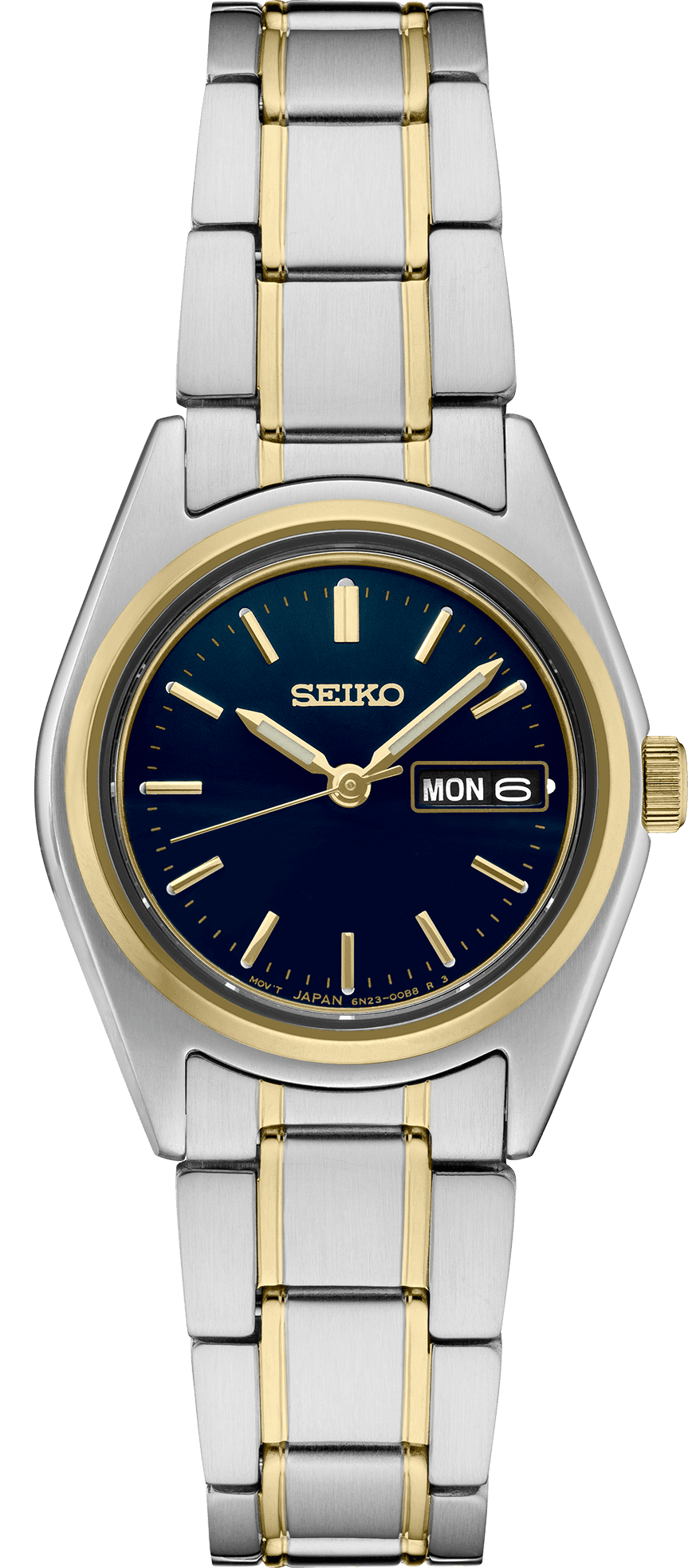 From the Essentials Collection. Offering classic dress/sport designs, the Essentials Collection provides the ideal solution for everyday wear. Crafted of stainless steel in versatile two-tone finish, this perfectly balanced watch features a blue sunray dial with day/date calendar and sleek gold stick markers for a superb blend of clarity and style. 10 bar, 100M Water Resistant