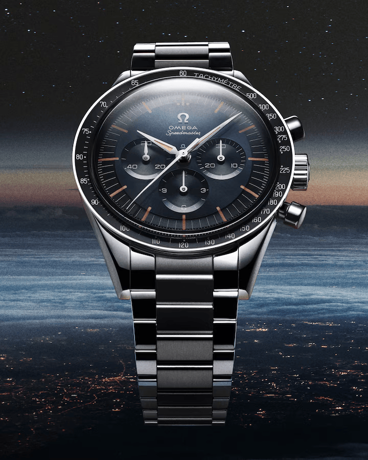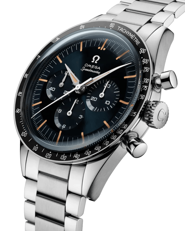 The 39.70 mm case is crafted in polished and brushed stainless steel and features a “flat links” bracelet with OMEGA’s patented comfort release adjustment system. The bezel ring is presented in black aluminium and includes the legendary tachymeter scale with an emblematic “Dot Over Ninety”.