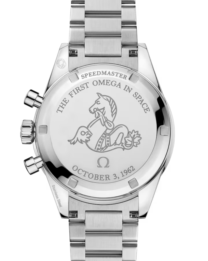 A vintage OMEGA logo is applied on the dial, as well as on the crown, while the caseback features the famous Seahorse medallion, and the engravings, “THE FIRST OMEGA IN SPACE” and “OCTOBER 3, 1962”.