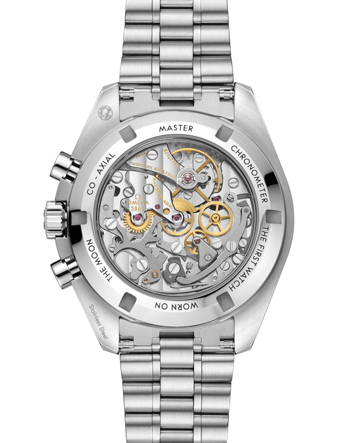 Presented on a polished-brushed bracelet, this 42 mm Moonwatch in stainless steel features sapphire crystal glass on the front as well as on the caseback. Inspired by the 4th generation Speedmaster style worn on the moon, it also includes an asymmetrical case, a white lacquered step dial with applied OMEGA logo and indexes, Moonwatch style hands, and the famous dot over 90 on the black anodised aluminium bezel ring.