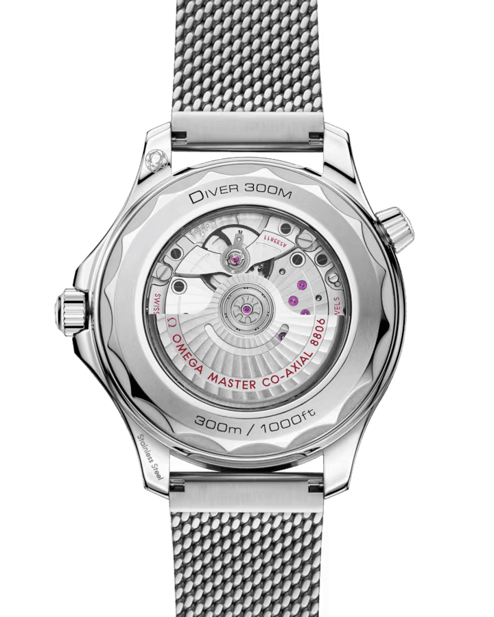 The watch is presented on a brushed mesh bracelet with clasp, and is driven by the OMEGA Co-Axial Master Chronometer Calibre 8806, which can be seen through the sapphire crystal caseback.