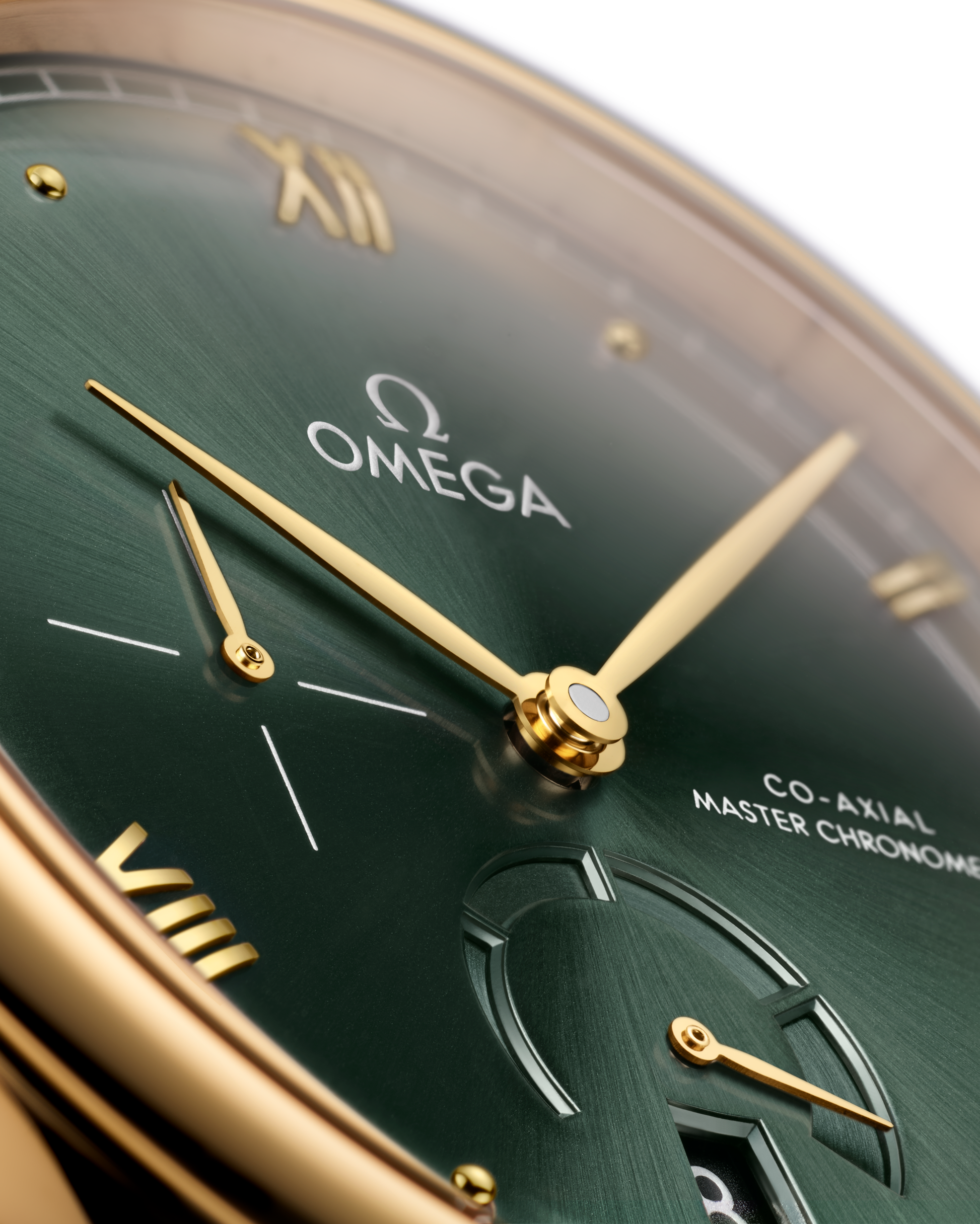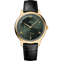 A timeless collection since 1994, the OMEGA De Ville Prestige is now in its third generation. Continuing to represent classical design and refined elegance, the timepieces offer a range of patterns, finishes and colours to suit different lifestyles and personalities.In this 41 mm 18K yellow gold model, the domed PVD dark green dial features a sun-brushed finish. The display is distinguished by yellow gold-plated hands, as well as alternating Roman numerals and cabochon indexes.The 270° power reserve indication is located at 6 o’clock. It is illustrated by 4 sectorial cut-throughs in crescent shape and an applied underplate in subtle contrasting finish of the same colour.The pure look of the timepiece is completed by a date window at 6 o’clock, a small-seconds subdial at 9 o’clock, and a railway minute track on the outer zone.This Master Chronometer certified watch is presented on a black leather strap and is driven by the OMEGA Master Co-Axial Calibre 8810, which can be admired through the scratch-resistant sapphire crystal caseback.