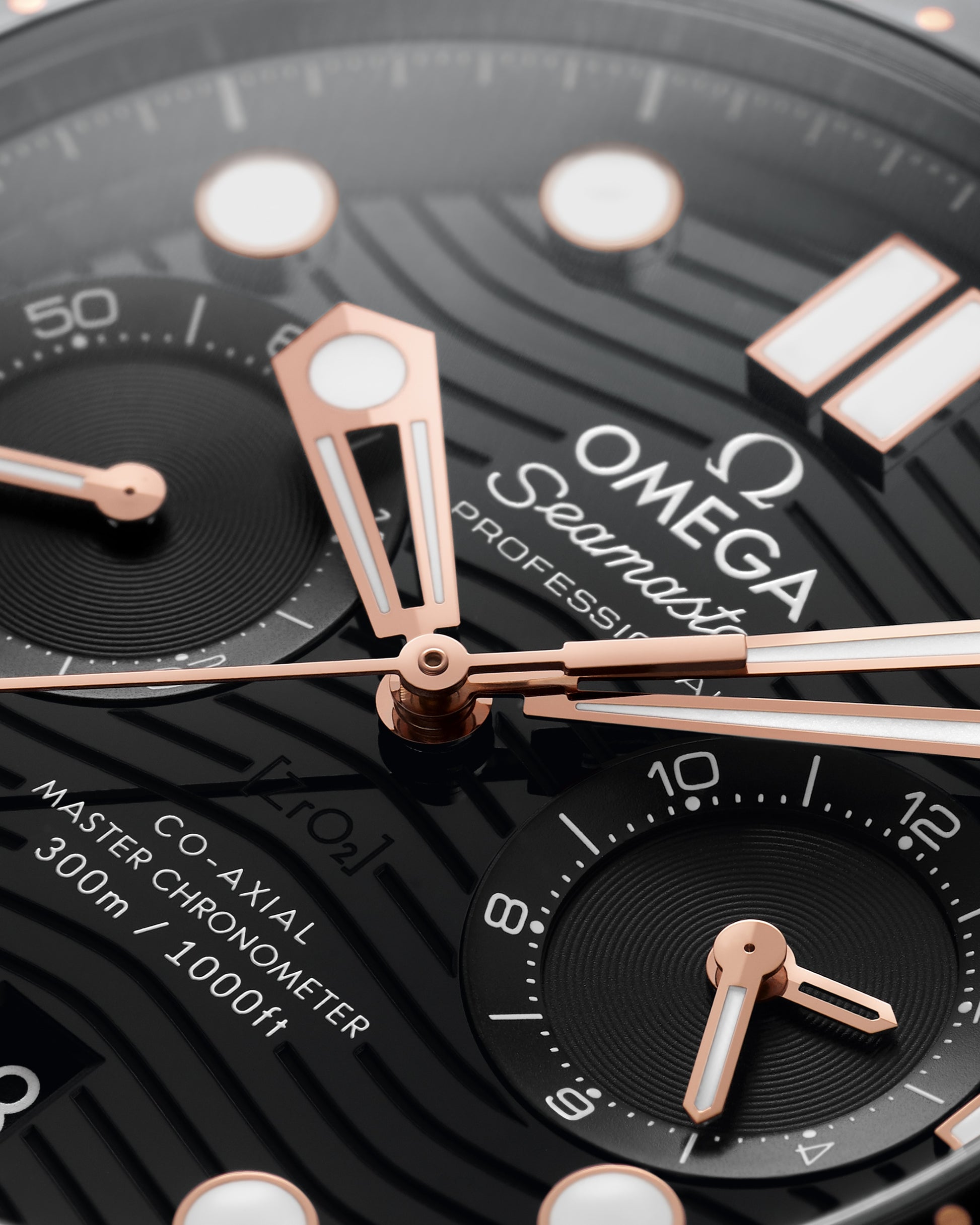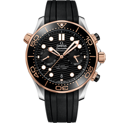 Since 1993, the Seamaster Professional Diver 300M has enjoyed a legendary following. Today’s modern collection has embraced that famous ocean heritage and updated it with OMEGA’s best innovation and design.This 44 mm chronograph model is crafted from stainless steel and 18K Sedna™ gold, and includes a polished black ceramic bezel with a Ceragold™ diving scale. The pushers are also polished black ceramic, as well as the dial which features laser-engraved waves and a date window at 6 o’clock.The subdial hands are 18K Sedna™ gold, along with all other hands and indexes which are filled with white Super-LumiNova.The watch is presented on a black rubber strap and is driven by the OMEGA Master Chronometer Calibre 9900, which can be seen through the sapphire-crystal on the wave-edged caseback.