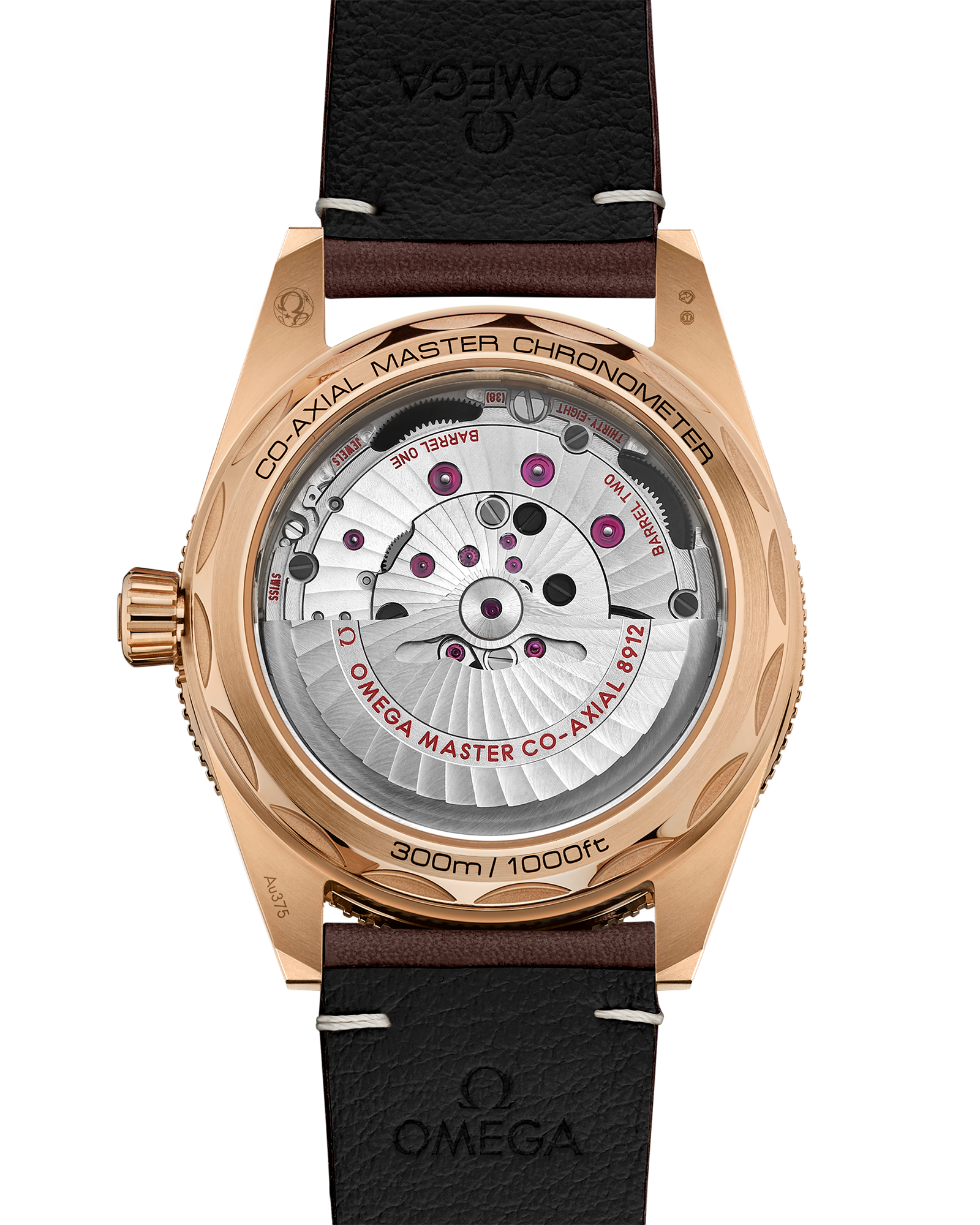 Presented on a brown leather strap with a 9K Bronze Gold buckle, this timepiece includes a transparent sapphire crystal caseback, enabling a clear view of the OMEGA Co-Axial Master Chronometer Calibre 8912.