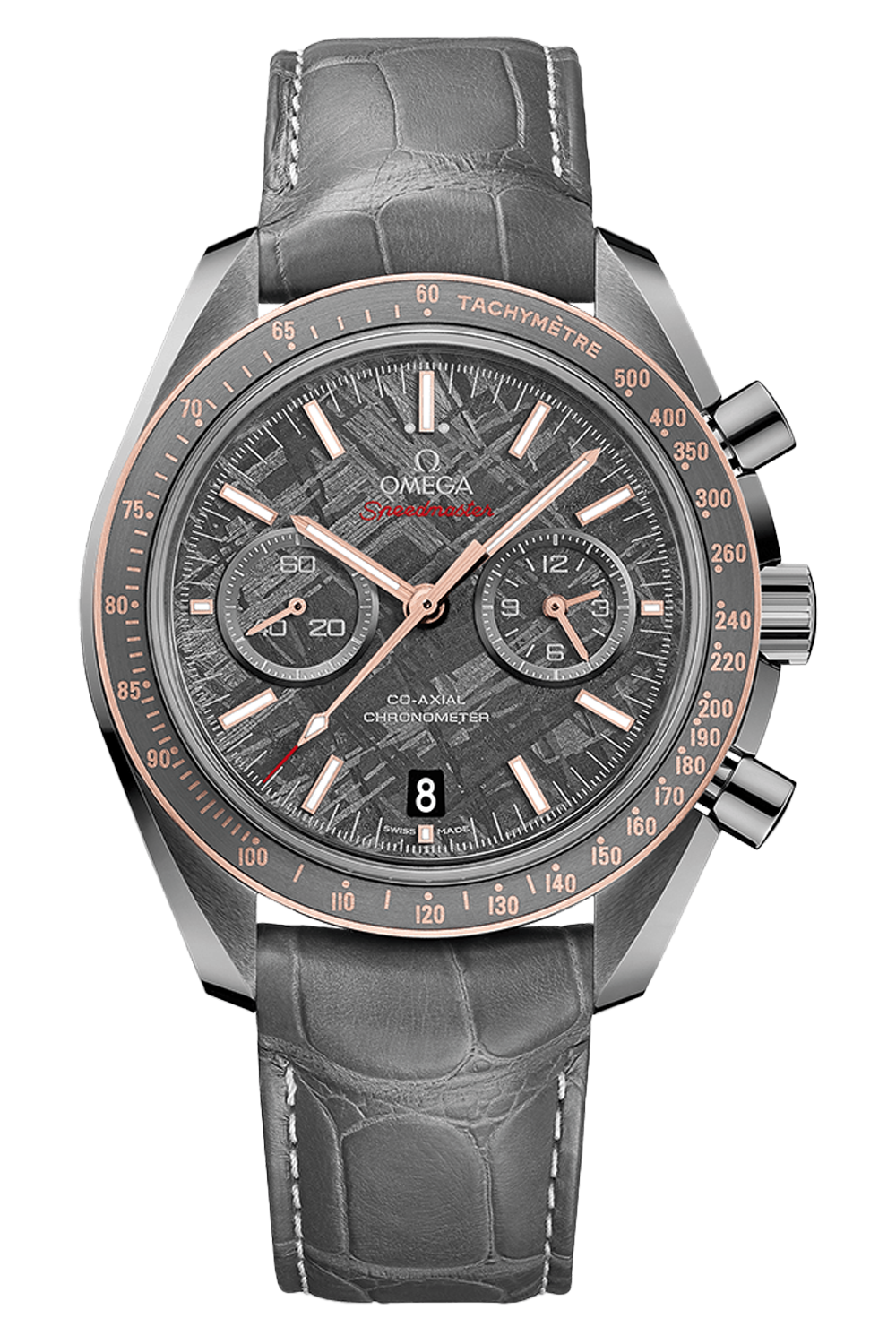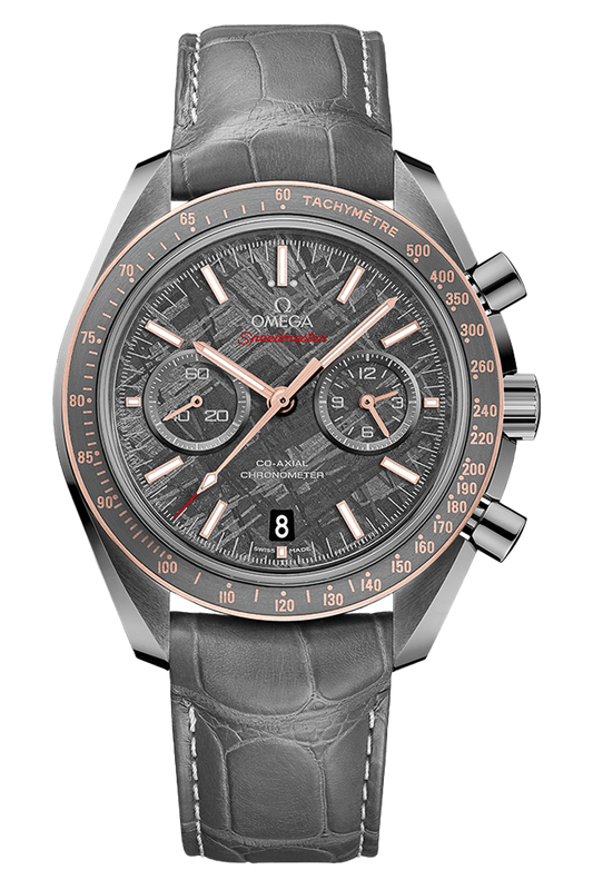 Reminiscent of its legendary predecessors, the Speedmaster Grey Side of the Moon ""Meteorite"" has a 60-minute and 12-hour recorder at 3 o’clock and a small seconds sub-dial at 9 o’clock. OMEGA’s Co-Axial calibre 9300 can be seen through the bevelled sapphire crystal caseback.