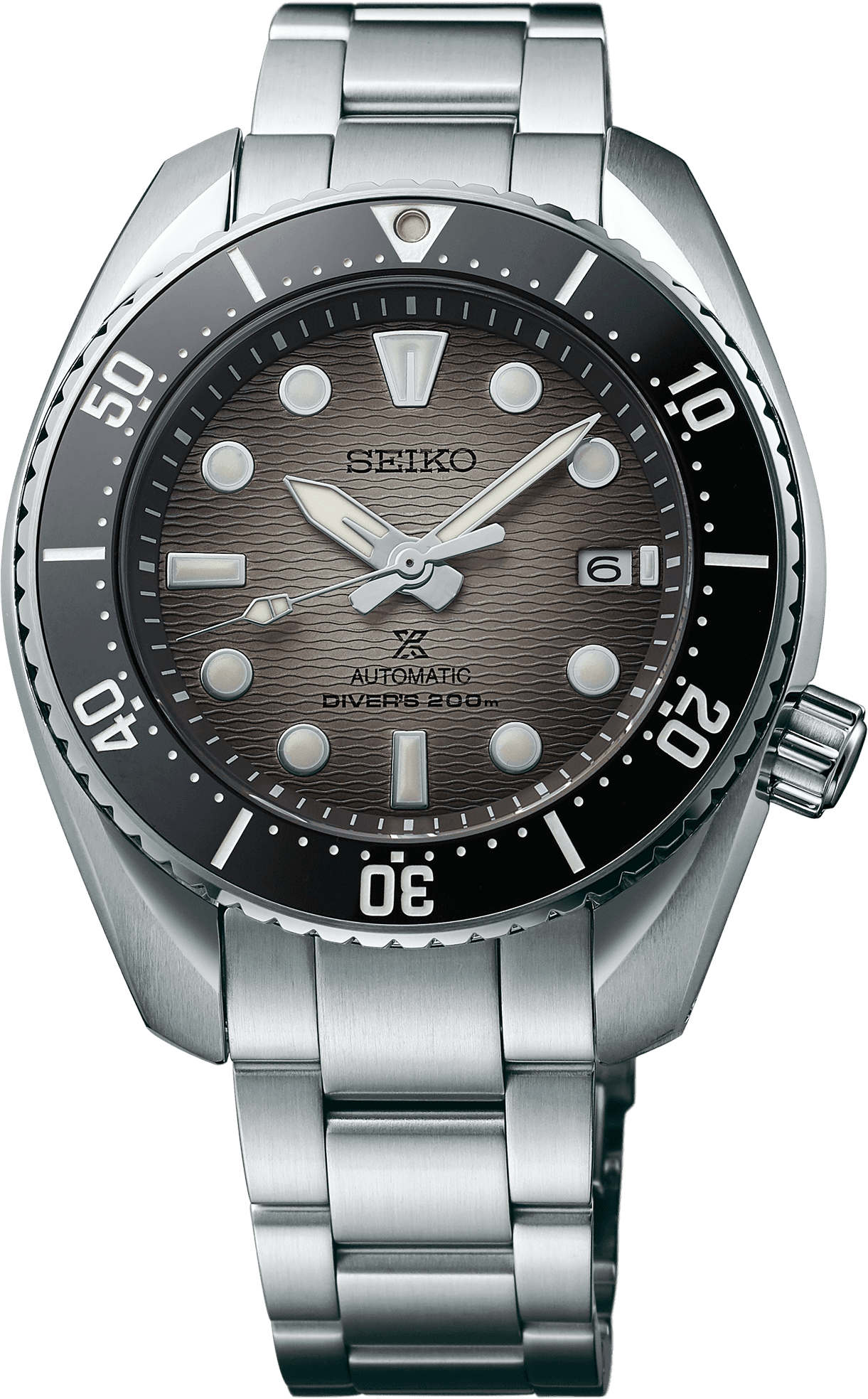 Prospex Automatic Diver's Watch. Designed for those who treat life as the ultimate adventure, the Seiko Prospex line meets every challenge with technological excellence and style. Part of a rich legacy of innovation in high-intensity timekeeping, Prospex continues to celebrate a long history of sports watch excellence with re-creations and re-interpretations of landmark achievements. Based on an iconic Seiko design, with upgraded materials, this automatic diver's watch is crafted of stainless steel with durable super-hard coating, and offers a black uni-directional rotating elapsed timing bezel in scratch-resistant ceramic, a sapphire crystal with anti-reflective coating on the inner surface, a screwdown crown and caseback, and a tri-fold clasp with push-button release, secure lock and extender. The distinctive press-patterned gradated gray dial features a date calendar and LumiBrite hands and markers. Following ISO standards for scuba diving to depths of up to 200 meters, this exceptional timepiece includes a 24-jewel automatic movement with a frequency of 21,600 vibrations per hour, a power reserve of approximately 70 hours, and manual winding capability. 200m Water Resistant