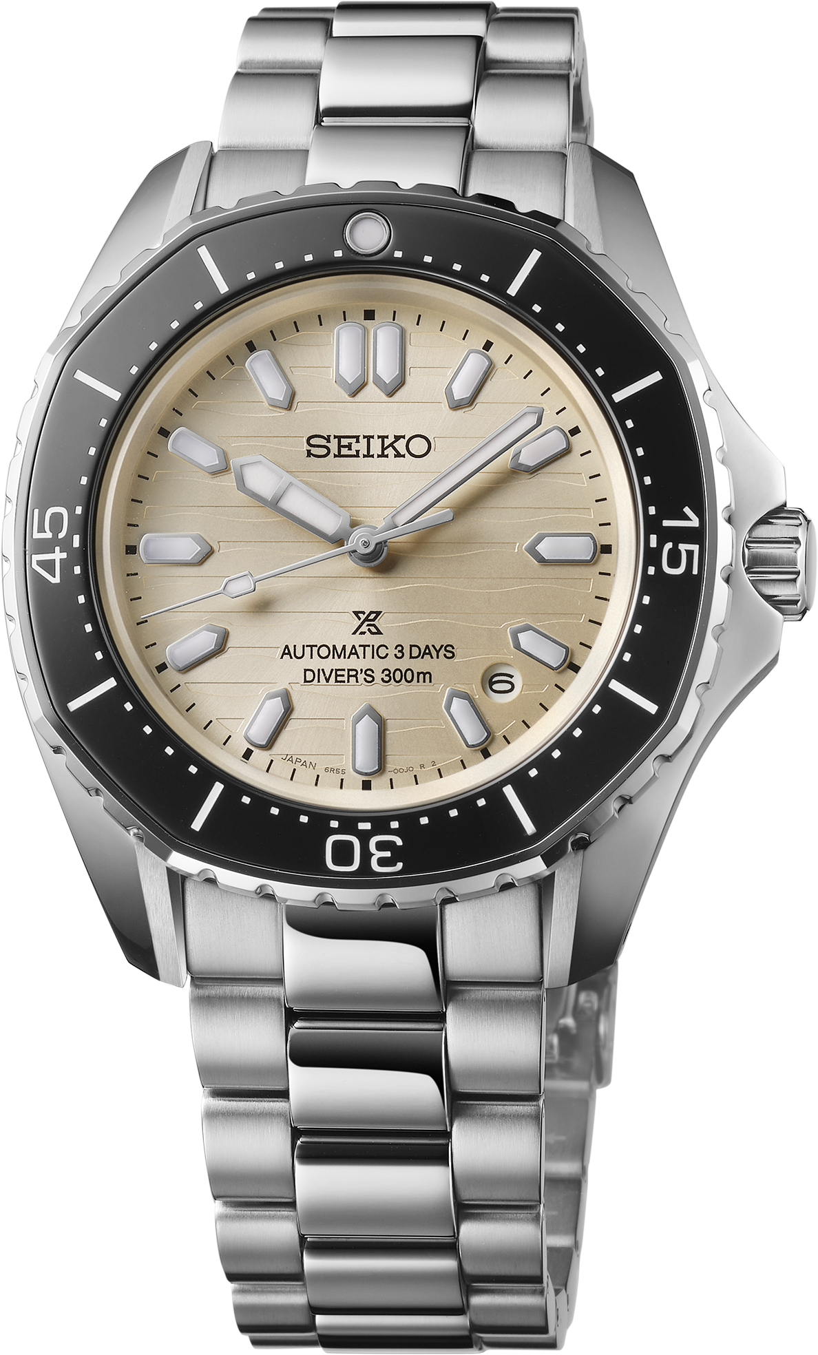 Prospex Automatic Diver’s Watch. Designed for those who treat life as the ultimate adventure, the Seiko Prospex collection meets every challenge with technological excellence and style, continuing the rich legacy of innovation in high-intensity timekeeping. Framed by a black polygonal uni-directional rotating elapsed timing bezel, suited for formal occasions while keeping an active and sporty impression, the ivory pressed pattern dial, inspired by a calm coastline, offers a date calendar between 4 and 5 o’clock allowing for LumiBrite coating on the hands and all 12 markers, improving symmetry and legibility. With an upgraded power reserve of approximately 72 hours, 3 full days, the 24-jewel automatic movement beats at a frequency of 21,600 vibrations per hour and features manual winding capability. Crafted of stainless steel with super-hard coating, this superbly functional diver’s watch includes a sapphire crystal with anti-reflective coating on the inner surface, as well as a screwdown crown and caseback. The bracelet is designed with mirror polish center links to match the sophisticated case design, which follows ISO standards for scuba diving to depths of 300 meters while maintaining a slim profile. 300m Water Resistant