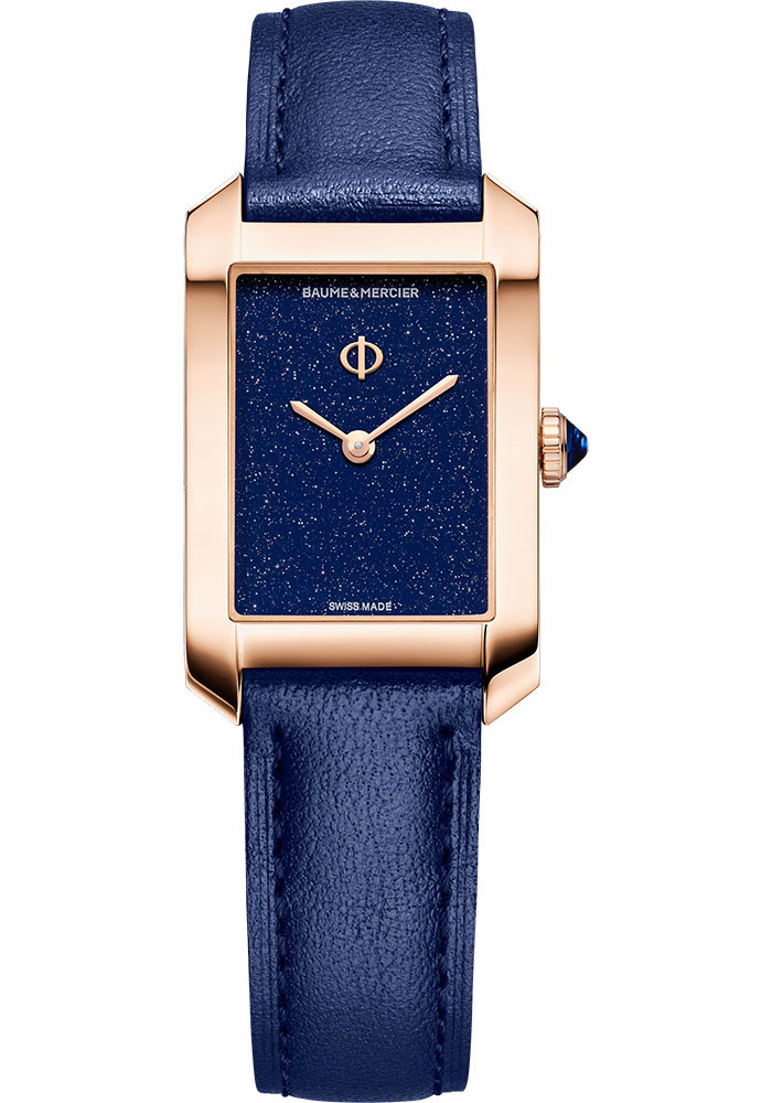 The two new Hampton models (10673 & 10674) are the worthy heirs of this approach, with their slim, well-balanced 35 x 22.2 cm cases that are 6.9 mm thick. The case is protected by a domed scratch-resistant sapphire crystal and houses a new-generation quartz movement with eight years of autonomy, indicating the hours and minutes. Both are covered with a delicately glittering varnish inspired by aventurine gemstones and star rubies, creating a sparkling effect that exalts the femininity of these elegant watches. The quest for a streamlined design, a signature of Baume & Mercier timepieces, is reflected in the minimalist presence of two “glaive” hands and an elegant Phi, the company’s logo, as an appliqué at 12 o’clock.