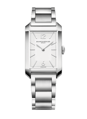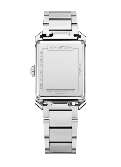 The rectangular shape of this timepiece reveals a harmonious rhythm that is both uniform and filled with contrasts, featuring subtle alternations of steel, gray and white; polished and satin-finished surfaces; and vertical and horizontal lines along the strap. At the center of the dial, the rectangular shape appears again, stretching from one end to the other of the rhodium-plated “glaive” hands. It extends all along the gray minute track to the perimeter of the dial, reaching the inner tips of the riveted, rhodium-plated Arabic numerals and indexes. The opaline white that deli-cately adorns the dial highlights each detail of this sought-after graphic composition.
