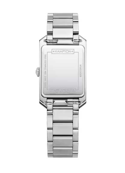 The Hampton mother-of-pearl rectangular watch for women comes with rhodium-plated sword-shaped hands, riveted indexes, and a diamond-set dial. The bracelet encompasses 3 rows of polished and satin-finished stainless steel, offering an elegant finish for this sophisticated quartz-powered timepiece.
