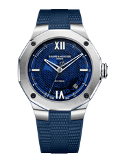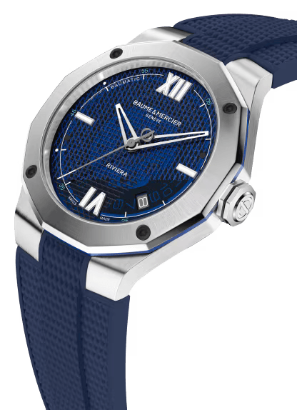 Fitted with a smoky blue sapphire dial and mesh decor with nautical accents, it also displays a number of more sporting specificities that set it apart from the other models in the collection: openworked hands, the four micro-blasted screws in black DLC-treated steel of its crown and the counterweight of its seconds hand stylized with the Phi symbol, the House's unmistakable emblem. Its steel case with taut and athletic lines has been designed to withstand a water resistance of 100 meters. All in sportiness and sobriety, the mention Riviera has been added at 6 o'clock and the name known to all Baumatic, balanced but discreet between 10 and 11 o'clock. On the sides of the case, a ring in blue anodised aluminum and the stripe of color in the center of its crown add an unexpected touch of technicality by subtly recalling the color of the dial. This summer's Riviera Baumatic 42 mm is powered by a Baume & Mercier movement with proven performance: five-day power reserve, precision of -4 s/+6 s on a daily basis as well as solid protection against magnetic fields.