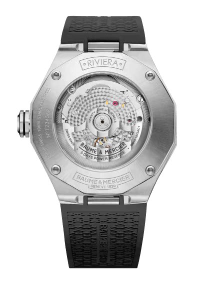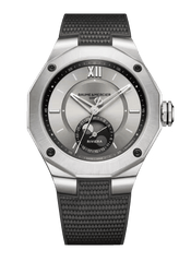 At first glance, it evokes the moon in its hues and mysteries. Wearing a grey rubber strap with canvas decoration, the new Riviera Baumatic"Moonphases"is sober. Its sand-colored dial is reminiscent of the large silvered deserts that make up the poetic landscapes we know from the Moon. Satin sunray and lacquered, its beautiful and complex dial is highlighted by a dark gray flange whose coloring subtly echoes the small auxiliary dial located at 6 o'clock displaying the date and moon phases. With its efficient and refined design, the new Riviera Baumatic moonphase displays its personality in a steel case with a diameter of 43 mm that takes up the characteristic codes of the Riviera family: a dodecagonal steel bezel fixed by 4 steel screws (black microblasted ADLC treatment), Roman numeral at 12 o'clock, riveted hour markers at 3 and 9 o'clock.