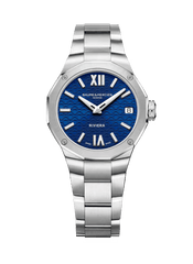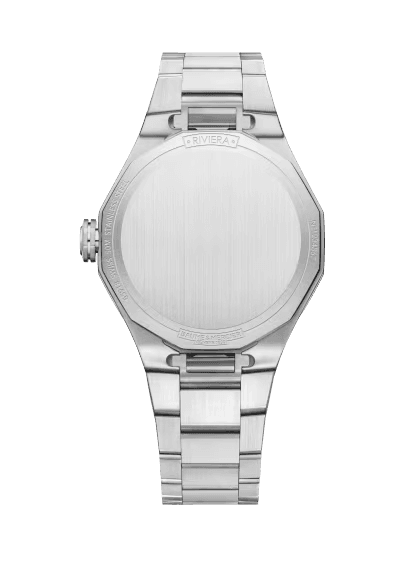 The azure blue of its sun-satin dial, adorned with a transparent wave transfer decoration, brings to mind the color of the water as it mirrors the blazing sun throughout the day. The date appears in an aperture at 3 o’clock, while the hours and minutes are indicated on Roman numerals and riveted indexes coated in Superluminova (C1, blue glow) by faceted rhodium-plated hands. The display is orchestrated by a quartz movement with a ten-year autonomy. The Brand’s emblem, the Phi logo, appears in relief on the free octagonal crown. The watch timepiece is water-resistant to 5 ATM (approx. 50m).