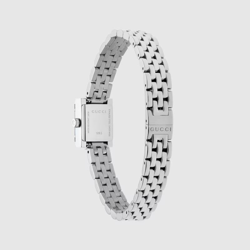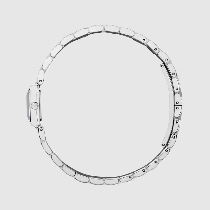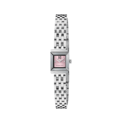 Defined by an elegant square shaped case, the G-Frame collection blends heritage details with a contemporary aesthetic. Crafted from a stainless steel case, the accessory is further enriched with a pink dial with diamonds and a stainless steel bracelet.