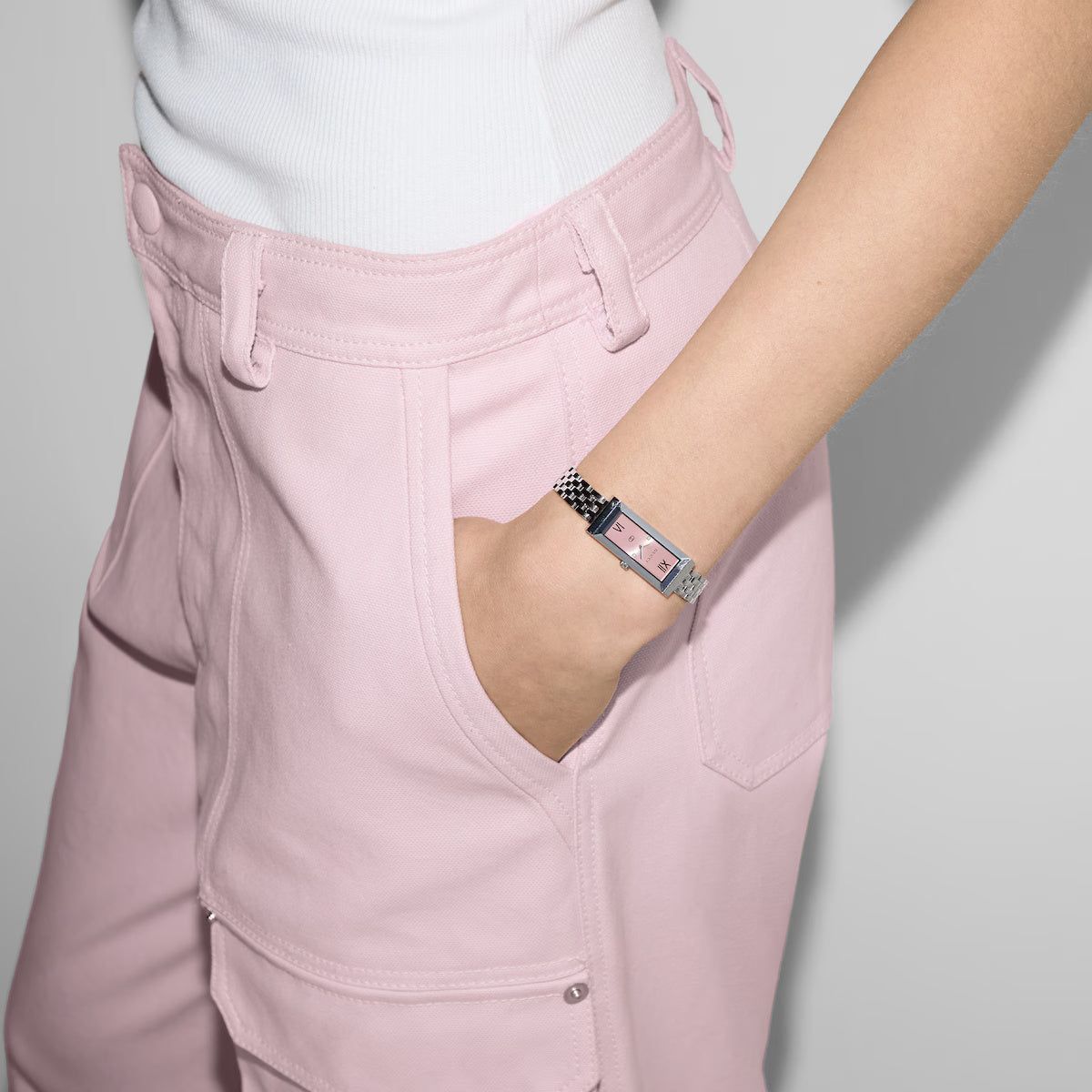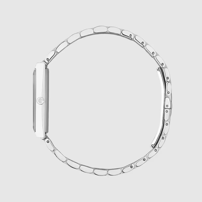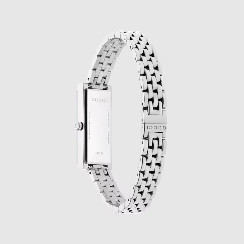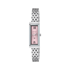 Defined by an elegant rectangular-shaped case, the G-Frame collection blends heritage details with a contemporary aesthetic. Crafted from a stainless steel case, the accessory is further enriched with a pink dial with diamonds.