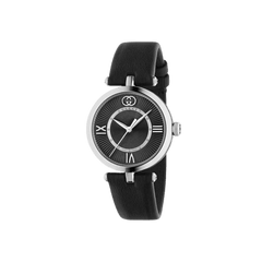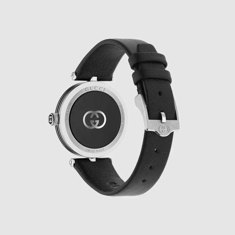 For the Cruise 2025 collection, the polished and minimalist look extends to jewelry and watches. Taking inspiration from archival codes, the Model 2000 design combines the Italian style with the Swiss craftsmanship. Presented with a black leather strap, this watch features a black guilloché dial, enriched with historic codes of the House.