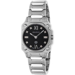 The Gucci G-Flat YA166507 is a sleek 24mm women's watch featuring a striking black dial adorned with diamond hour markers, blending elegance with modern minimalism. Crafted from polished stainless steel, it showcases the iconic octagonal case design inspired by architectural forms. Powered by a reliable quartz movement, this timepiece is a refined statement of timeless luxury.