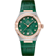 Crafted in stainless steel and 18K Sedna™ gold, it has a diamond-paved bezel and a date window at 6 o’clock. The hands, hour markers, OMEGA logo and Constellation star are in 18K Sedna™ gold.