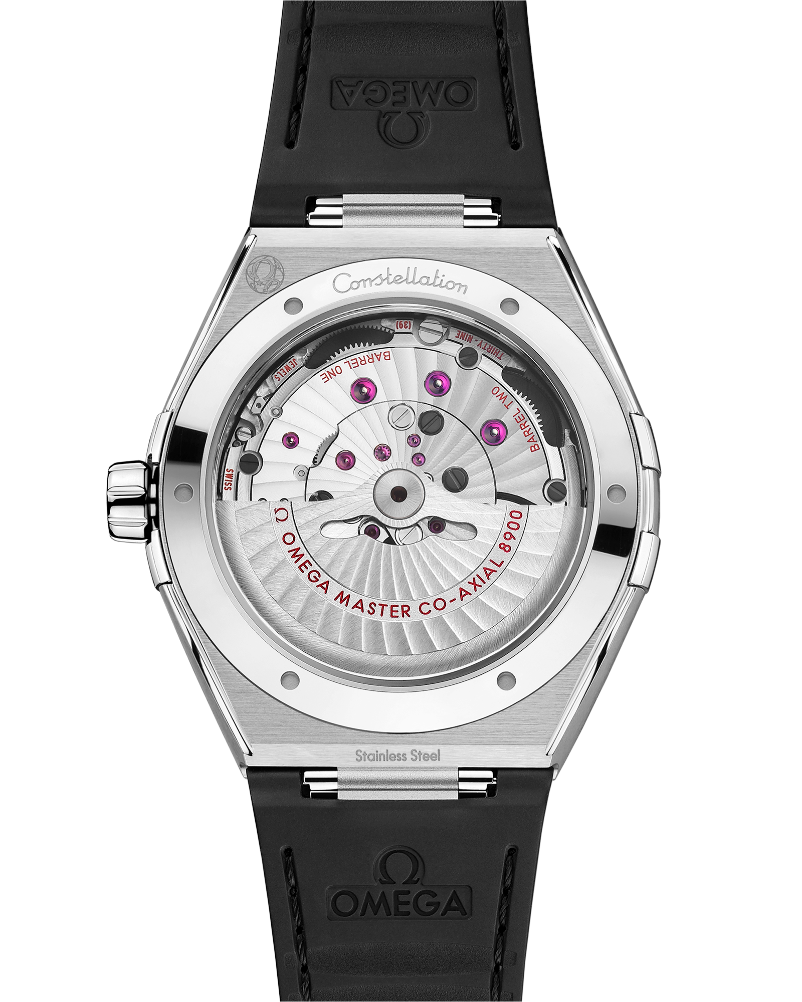 Presented on a black leather strap with rubber lining, this timepiece is driven by the OMEGA Co-Axial Master Chronometer Calibre 8900, visible through the domed scratch-resistant sapphire crystal."