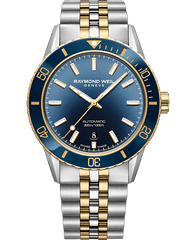 Equipped with a screwed-down case-back, the rear of the watch is engraved with a water landscape, representing the freedom felt on the water and the independent spirit and signature of Raymond Weil. The folding clasp of the two-tone yellow gold plated stainless steel bracelet has a double push-security system and an integrated steel diver extension that allows for easy strap width adjustment.