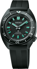 Prospex Black Series Limited Edition. Designed for those who treat life as the ultimate adventure, the Seiko Prospex line meets every challenge with technological excellence and style. Part of a rich legacy of innovation in high-intensity timekeeping, Prospex continues to celebrate a long history of sports watch excellence with re-creations and re-interpretations of landmark achievements. Based on an iconic design, this extraordinary Black Series Limited Edition, available only in a controlled production run of 4,500 with the serial number engraved on each caseback, expresses the view seen through a night vision scope, and features hands and markers with Seiko's brighter and longer lasting "Green LumiBrite Pro," suitable for professional usage and providing maximum visibility with the color most recognizable in the dark. Following ISO standards for scuba diving to depths of up to 200 meters, this exceptional timepiece includes a 24-jewel automatic movement with a frequency of 21,600 vibrations per hour, a power reserve of approximately 70 hours and manual winding capability. With Seiko's thinnest mechanical diver's watch case, in stainless steel with black hard coating, this dramatic watch includes a black dial, date calendar, curved sapphire crystal with anti-reflective coating on the inner surface, screwdown crown and caseback, black uni-directional rotating elapsed timing bezel and black silicone strap. 200m Water Resistant