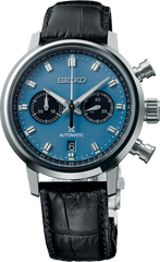 Prospex Speedtimer Mechanical Chronograph. Designed for those who treat life as the ultimate adventure, the Seiko Prospex line meets every challenge with technological excellence and style. Celebrating Seiko's first precision chronographs, developed for international sporting competitions in 1964, as well as its 1969 introduction of the world's first automatic chronograph, this exceptional watch provides chronograph measurement of up to 30 minutes of elapsed time in 1/8-second increments. The 34-jewel automatic movement, visible through the screwdown see-through caseback, beats at a frequency of 28,800 vibrations per hour, with a power reserve of approximately 45 hours and manual winding capability. The proprietary 8R46 movement includes a column wheel and vertical clutch mechanism allowing for smooth, stutter-free movement of the chronograph hand while providing longer wear and efficiency, and maintaining the power reserve better during chronograph operation. Crafted of stainless steel with super-hard coating and tri-fold push button release clasp, this extraordinary timepiece also features a vibrant blue dial with LumiBrite hands and markers topped by a dual curved anti-reflective sapphire crystal and is paired with a sleek black crocodile strap. 10 bar, 100M Water Resistant
