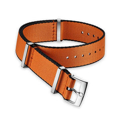 Orange nylon fabric strap with black borders, stainless steel buckle and fitted keepers. OMEGA’s NATO-inspired straps have been influenced by some particularly robust and storied ancestors and can trace their earliest origins to the Second World War. Available in a variety of bold colours and materials, the “NATO” straps of today convey the essence of the originals while exhibiting a more contemporary and stylish look.