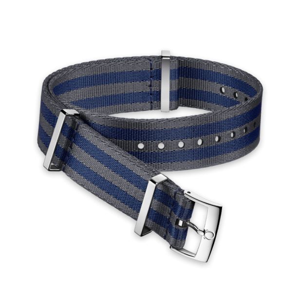 5-stripe grey and blue nylon fabric strap with stainless steel buckle and fitted keepers OMEGA’s NATO-inspired straps have been influenced by some particularly robust and storied ancestors and can trace their earliest origins to the Second World War. Available in a variety of bold colours and materials, the “NATO” straps of today convey the essence of the originals while exhibiting a more contemporary and stylish look.