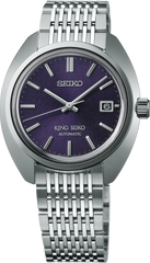 From the King Seiko Collection. First introduced in 1961, King Seiko became one of Seiko’s most technically innovative and stylish brands, noted for its sleek, dignified profile. Inspired by the King Seiko designs from the late 1960s, this elegant timepiece features a specially developed slim case with curved edges to resemble the vintage models, achieving an astounding thickness of only 9.9mm. The 26-jewel 6L35 movement beats at a frequency of 28,800 vibrations per hour with a power reserve of approximately 45 hours and offers manual winding capability and a bi-directional winding system with rapid date change mechanism while maintaining a slim design. Reflecting the city of Tokyo, where tradition and modernity coexist, the dial is inspired by the blue-ish purple hue, once reserved for nobility, that became fashionable and more widely available in Japan during the Edo period. This rich dial features a prominent 12 o’clock marker decoratively carved with an arrow feather pattern, a date calendar, and hour and minute hands cut on three sides to provide enhanced beauty and visibility. Crafted of stainless steel, the case flows seamlessly to the multi-row bracelet equipped with impressively narrow links to realize a truly streamlined fit on the wrist. With finishing characteristic of the original collection, this exceptional timepiece displays a King Seiko crest on caseback and crown and includes a box shaped sapphire crystal with anti-reflective coating on the inner surface and a deployment clasp with push-button release. 5 bar, 50M Water Resistant