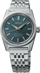 From the King Seiko Collection. First introduced in 1961, King Seiko became one of Seiko’s most technically innovative and stylish brands, noted for its sleek, dignified angularity. Paying tribute to the iconic original with updated styling and technology, this distinctive timepiece, in a sleek smaller case size, draws inspiration from 1960’s Tokyo fashion, during the same decade when King Seiko was making its mark in Japan. Evoking the “Ivy” aesthetic and color scheme, popular during the era, this timepiece offers a bold teal blue dial with retro beige LumiBrite hands and markers and is topped by a box-shaped sapphire crystal with anti-reflective coating on the inner surface. The 24-jewel automatic movement, with an exceptional power reserve of approximately 72 hours, beats at a frequency of 21,600 vibrations per hour and provides manual winding capability. Crafted of stainless steel, with the combination of mirror and hairline finishing characteristic of the original King Seiko models, this superbly wearable watch features the King Seiko crest on the crown and screwdown caseback and includes a bracelet with two levers on the endpiece that can be pressed for easy removal and a deployment clasp with push button release. 10 bar, 100M Water Resistant