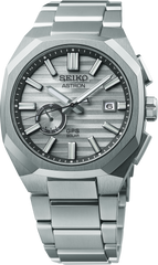 Astron GPS Solar Limited Edition. With the strong, sleek lines of the Seiko Astron, the world’s first commercially available quartz watch, today’s Astron is designed for a new generation of leaders, breaking through to the future with excellence in both innovation and style. Available only in a controlled-production run of 1,500, with the serial number engraved on each caseback, this distinctive Limited Edition, with its perfectly sculpted octagonal titanium bezel, combines solid tailoring with the highest degree of accuracy possible in a wristwatch. Powered by Seiko’s new GPS solar caliber 3X62, with the improved receiver sensitivity required by the metallic bezel, this exceptional watch is GPS controlled for high-speed time and time zone adjustment to 39 time zones, and includes an in-flight mode and perpetual date calendar correct to the year 2100. To ensure smooth operation, the watch is equipped with a signal reception result indicator and power save function. The solar cell is powered by light energy, with no battery change required. With a strikingly geometric horizontal pressed pattern, the silver dial features a multi-function indicator subdial for easy mode reference, as well as sharp and highly visible three-dimensional applied indices, and LumiBrite hands and markers. Crafted of light and durable titanium, with a super-hard coating for added endurance, this superb timepiece also offers a sapphire crystal with super-clear coating, secure screwdown caseback and tri-fold push button release clasp with smart-adjuster function. 10 bar, 100M Water Resistant