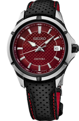 From the Coutura Collection. Delivering the perfect blend of edge and elegance for those on the move, the Coutura Collection combines bold angularity and shading with superior timekeeping for effortless sport/dress style. Inspired by motor sports, with a case design incorporating the angles and edges of racecar architecture, this dashingly sculpted timepiece features a multi-layer carbon-fiber patterned red dial styled with applied indices for a rich dimensionality and includes a date calendar, white second hand, and LumiBrite hands and markers. Crafted of stainless steel with black accents and a black perforated leather strap with red stitching, designed to echo driving gloves, this dynamic watch is equipped with a scratch-resistant sapphire crystal, screwdown caseback, tri-fold push button release clasp and a cabochon crown for a truly tailored look. 10 bar, 100M Water Resistant