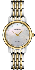 Stainless steel case with a two-tone (silver-tone and gold-tone) stainless steel bracelet. Fixed gold-tone bezel. Mother of pearl dial with gold-tone hands and diamond hour markers. Dial Type: Analog. Seiko caliber V115 eco-drive movement with a 12-month power reserve. Scratch resistant Hardlex crystal. Pull / push crown. Solid case back. Round case shape. Case size: 29.5 mm. Case thickness: 6.7 mm. Band width: 14 mm. Fold over clasp with a push button release. Water resistant at 30 meters / 100 feet. Functions: hour, minute. Dress watch style. Seiko Diamonds Mother of Pearl Dial Ladies Watch SUP398.
