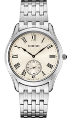 From the Essentials Collection. Offering classic dress/sport designs, in two sizes to suit anyone’s personal style, the Essentials Collection provides the ideal solution for everyday wear. Crafted of stainless steel with a scratch-resistant sapphire crystal, classic cabochon crown, and tri-fold push button release clasp this sophisticated design features an antique ivory dial with elegant Roman numerals, finely shaped hands and a seconds subdial. 5 bar, 50M Water Resistant