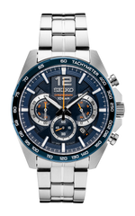 From the Men’s Essential Collection. A perfect blend of precision and design, this dashing chronograph is inspired by racing, hinting at a dashboard in its embossed dial with metallic elements and bright accents. Crafted of stainless steel, with secure screwdown caseback and blue ion-finish tachymeter bezel. The blue multi-layered dial, with orange accents, features LumiBrite hands and 12 o’clock marker, a date calendar and three subdials, one a 24-hour indicator. Chronograph timing provides measurement of up to 60 minutes of elapsed time in 1/5-second increments. 10 bar, 100M Water Resistant