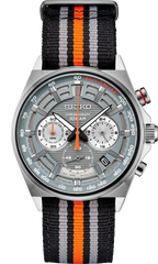 From the Essentials Collection. Inspired by racing, this rugged chronograph combines functionality and fashion for perfect sport or everyday wear. Framed by a gray tachymeter outer ring, the dimensional embossed gray dial features applied metallic elements and orange accents. Designed to resemble an engine compartment, the dial also offers three subdials, including a 24-hour indicator, a date calendar, and LumiBrite hands and markers. Chronograph timing provides measurement of up to 60 minutes of elapsed time in 1/5-second increments. Crafted of stainless steel with black, gray and orange racing stripe nylon strap. 10 bar, 100M Water Resistant