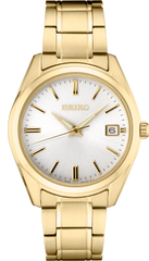 From the Essentials Collection. With classic dress/sport styling, this perfectly tailored design combines sophisticated minimalism with versatility. The clean white dial features a date calendar and LumiBrite hands. In stainless steel with gold finish, and sapphire crystal for superior scratch resistance. 10 bar, 100M Water Resistant