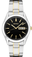 From the Essentials Collection. Offering classic dress/sport designs, the Essentials Collection provides the ideal solution for both everyday wear and dress occasions. Crafted of durable stainless steel, with two-tone polished and brushed finishes, this perfectly tailored design features a black sunray dial with gold accents, day/date calendar and LumiBrite hands and markers. 10 bar, 100M Water Resistant