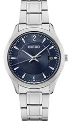 From the Essentials Collection. Offering classic dress/sport designs, the Essentials Collection provides the ideal solution for everyday wear. Crafted of stainless steel, this perfectly tailored watch features a patterned blue dial with date calendar, as well as Arabic numerals and stick markers, for a superb blend of clarity and style. The sapphire crystal adds superior scratch resistance. 10 bar, 100M Water Resistant
