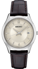 From the Essentials Collection. Offering classic dress/sport designs, the Essentials Collection provides the ideal solution for everyday wear. Crafted of stainless steel, this perfectly tailored watch features a patterned antique white dial with date calendar, as well as Arabic numerals and stick markers, for a superb blend of clarity and style. With brown leather strap and a sapphire crystal for superior scratch resistance. 10 bar, 100M Water Resistant