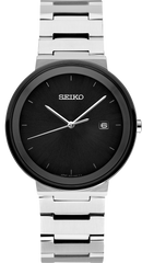 From the Essentials Collection. Offering classic dress/sport design, the Essentials Collection provides the ideal solution for everyday wear. With contemporary minimalism, this sharp and streamlined watch offers a sleek black sunray dial with date calendar, black bezel, and a slim and comfortable stainless steel case and bracelet. 3 bar, 30M Water Resistant